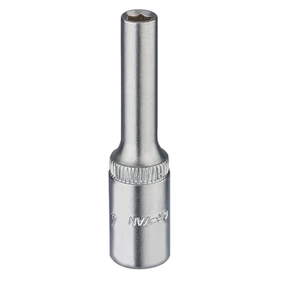 General description This is a professional-quality 1/4" drive metric deep socket, specifically a 4mm size. It is designed for durability and precision, suitable for various mechanical and DIY applications. The socket features a chamfered end for easy nut alignment and entry, and a hole for a spring-loaded ball bearing to secure accessories. Made from hardened, tempered, and chrome-plated chrome vanadium steel, it offers corrosion resistance and long-lasting performance. Technical specifications Material: Chrome vanadium steel, hardened, tempered, and chrome plated Size: 4mm Drive size: 1/4 inch Type: Deep socket Overall length: 50mm Standards: DIN 3124/ISO 2725 and DIN 3120/ISO 1174 Compatibility and accessories Compatible with 1/4" drive ratchets and extensions Designed to work with various nuts and bolts matching the 4mm size Installation Attach the socket to a compatible 1/4" drive ratchet or wrench Ensure the spring-loaded ball bearing secures the socket onto the drive tool Usage