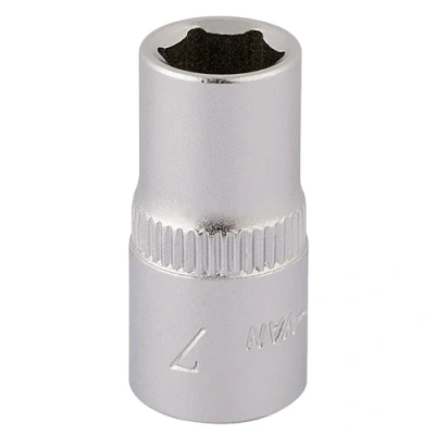 General description This is a 7mm 1/4-inch square drive hexagon socket designed for use with compatible tools. It features a chamfered end that facilitates easy nut positioning and entry, making your work more efficient and precise. Technical specifications Size: 7mm Drive Size: 1/4 inch Type: Hexagon socket Material: Likely durable steel Compatibility and accessories Compatible with 1/4-inch drive tools Suitable for use with various ratchets and extension bars that accept 1/4-inch sockets Installation Insert the socket onto a compatible 1/4-inch drive ratchet or tool Ensure it clicks securely into place before use Usage Use for tightening or loosening nuts and bolts with a 7mm hex head Ideal for DIY projects, home repairs, and mechanical work requiring precise hexagon fittings