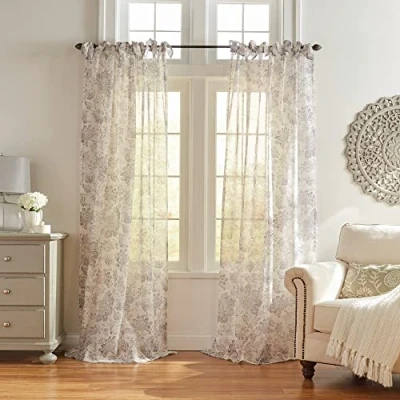 SHEER ELEGANCE: Enjoy a light and airy ambiance as this sheer curtain allows soft natural light to filter through while providing some privacy. Our window curtain is available in soft neutral tones, allowing you to find the perfect match for your home decor. JACOBEAN FLORAL PRINT: The sheer fabric and timeless distressed floral print design of our Westport curtain make it a versatile choice for any interior style, whether it be contemporary or traditional. It effortlessly enhances the aesthetic of your living room, bedroom, nursery, home office, or any other room in your home. ADJUSTABLE TIE-TOP HEADER: The unique bunny-ear tie-top header design ensures a custom fit to any size curtain rod. Adjust the curtain easily to achieve the desired look and enjoy a hassle-free installation process. EASY MAINTENANCE: Crafted from a poly-linen blend, this sheer panel is designed to withstand regular use and is easy to maintain. It can be machine washed, saving you time and effort in keeping it clean and fresh. FOUR GENERATIONS OF QUALITY & FASHION: Elrene Home Fashions has been designing and producing high-quality home decor since 1922. With our passion for design and commitment to quality, we specialize in creating products that seamlessly blend functionality with elegance.