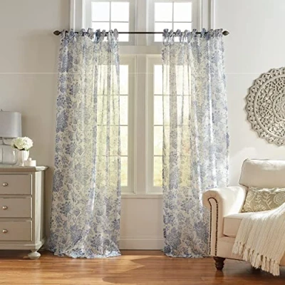 Elrene Floral Tie Top Sheer Window Curtain Panel, Poly Linen Blend, Indigo, 52" W x 84" L (Pack of 1)