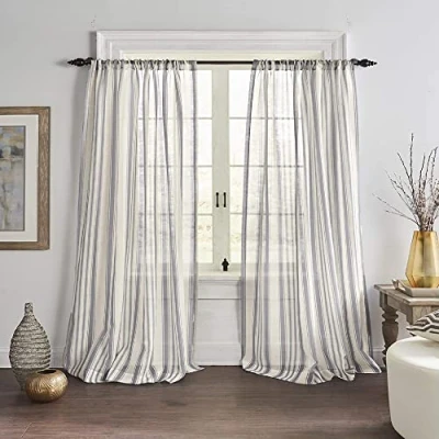 Sheer Elegance Enjoy a light and airy ambience as this sheer curtain allows soft natural light to pass through while providing a certain level of privacy and creating a welcoming atmosphere in your home. TIMELESS STYLE Dress up your windows with the classic appeal of our Hampton sheer window curtain. Featuring a tiered striped pattern, these versatile panels add a touch of sophistication to any room. Choose from a range of colours including blue, grey or linen to effortlessly complement your existing decor and add an upscale coastal inspired flair to your living space. EFFORTLESS HANGING This single curtain panel features a 3" rod pocket that is compatible with curtain rods up to 1" in diameter ensuring a perfect fit for a variety of rod sizes. With the rod pocket design, you can easily slide the curtain panel onto your curtain rod without the need for additional hardware such as hooks or rings. EASY CARE Our polyester linen blend combines the durability and easy care properties of polyester with the natural texture of linen. Designed to withstand regular use and is easy to maintain. It can be machine washed, saving you time and effort to keep it clean and fresh. FOUR GENERATIONS OF QUALITY AND FASHION Elrene Home Fashions has been designing and producing high-quality home decor since 1922. With our passion for design and commitment to quality, we specialize in creating products that seamlessly blend functionality with elegance.