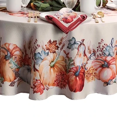 Fashion and Function: Inspired by the harvest, this tablecloth features autumnal flowers and pumpkins in shades of brown, rust, blue and orange to bring an inviting look to your fall tablescape. Versatile: Ideal for holidays, special occasions, events, parties, family gatherings, hostess gifts, and everyday use during the autumn season. Premium Quality: Made from thick, premium quality polyester, our heavy weight fabric is designed to stand up to years of use. The artfully hemmed edges add a finished look and prevent wear and tear. Included: Sold as a single tablecloth. Coordinating napkins, placemats and table runner are sold separately. Easy Care: Machine washable and dryer safe for effortless upkeep. Tumble dry on low heat and cool iron as needed.