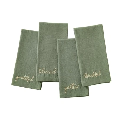 Elrene Home Fashions Harvest Fall Sentiment Embroidered Napkins, Set of 4, 17"x17", Green
