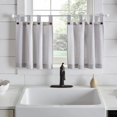 ELEGANT BATH & KITCHEN TIERS: Decorate your kitchen, café, bathroom, or dining room with simple elegance, and embrace your trendy side with the Elrene Home Fashions Tucker Ticking Stripe Tier Window Curtains. TRENDY PATTERN & DESIGN: The trendy color and ticking stripe design, complemented by large wooden buttons, give a fashionable tailored farmhouse and shabby-chic appearance to your home decor. HIGH-QUALITY HOME DECOR: Made from durable and soft 100% cotton fabric, this curtain-panel set hangs beautifully from 3-inch tabs and can fit a curtain rod up to 1" in diameter. Tab top header length is included in the provided length measurement. FASHIONABLE & EASY CARE: Great looks meet easy care with this classy farmhouse kitchen decor. A simple machine wash and dry and a quick iron will keep these stylish curtains looking their best. FOUR GENERATIONS OF QUALITY & FASHION: Elrene Home Fashions has been designing and producing high-quality home decor since 1922. We focus on creating decorator looks and exciting designs for your home.