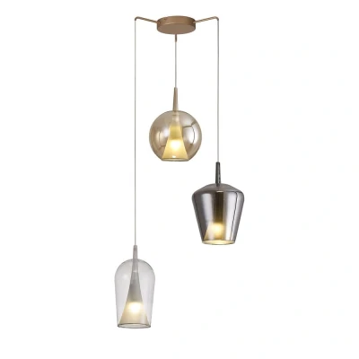 Elsa Pendant With Mixed Shades, 3 Light E27, Clear/Chrome/Bronze Glass Frosted Inner Cone, Gold Frame