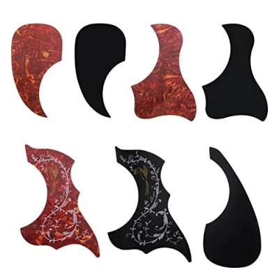 Function: Protect your acoustic guitar surface from scratches on picks and nails, it also decorate your guitar at the meantime. Easy to use: Comes with self-adhesive tape on the back, just peel off the tape and stick on the guitar. Package includes: Contains 7 pieces of pickguards in different styles, including bird shape and drop shape to meet various style of guitars. Material: Made of plastic, wear-resistant, smooth surface, durable in use. The design is beautiful and versatile. Note: There are two layers of paper on the upper and lower surfaces to tear off.