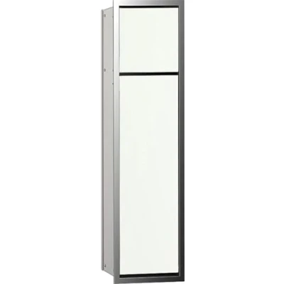 The all-rounder: the bathroom cabinet as a flush-mounted model offers storage space for all toilet utensils without taking up space in the bathroom and is particularly easy to install. Practical design: with the subtle toilet paper dispenser and the toilet brush set holder, everything is hidden in a stain and discreetly hidden in the wall. High-quality look: the split glass front in Optiwhite is a subtle eye-catcher and fits perfectly into the bathroom thanks to flush installation and handle-free look. ASIS 150: The ASIS 150 module series is characterised by its particularly narrow products, which enhance any bathroom with glossy fronts and create valuable storage space. Dimensions and details: Emco ASIS 150 bathroom built-in cabinet with toilet paper dispenser ideal for the guest toilet; 2-door in optic white; dimensions: 16.8 cm x 65.4 cm x 15.3 cm (W x H x D); item number 974027840.
