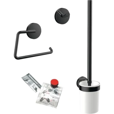 EMCO Round Toilet 3 Piece Bathroom Accessory Set Including Towel Hook, Paper Holder, Brush in 1 Perfect for Any Bathroom, Black