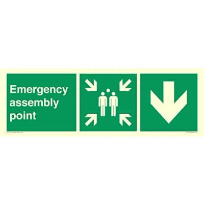 No Symbol This sign is made from vinyl photoluminescent sticker 41 landscape Sign Text: Emergency assembly point directional Down arrow