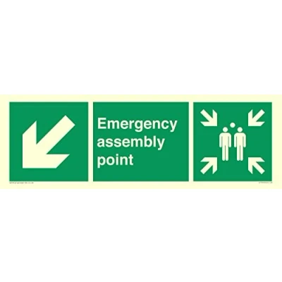 E912 : Down left arrow (45 deg supplimentary) This sign is made from vinyl photoluminescent sticker 62 landscape Sign Text: Emergency assembly point directional Down left arrow