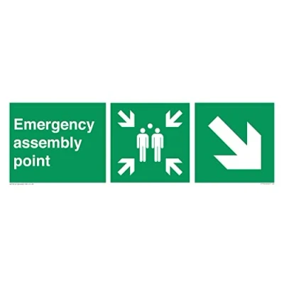 E910 : Down right arrow (45 deg supplimentary) This sign is made from vinyl / sticker Air Release vinyl makes it easy to stick to flat, clean surfaces without bubbles. Not for rough, plastic or dusty surfaces. 62 landscape Sign Text: Emergency assembly point directional Down right arrow