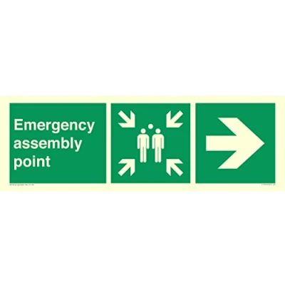 E909 : Right arrow (90 deg supplimentary) This sign is made from vinyl photoluminescent sticker 62 landscape Sign Text: Emergency assembly point directional Right arrow