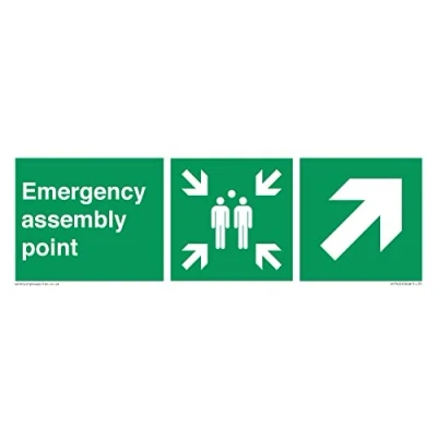 E908 : Up right arrow (45 deg supplimentary) This sign is made from correx corrugated plastic 5mm 5mm fluted polypropylene"Correx" style material that can be screwed, stuck, stapled or fixed to posts and fences using cable ties. Fully recyclable and perfect for temporary signs. 31 landscape Sign Text: Emergency assembly point directional Up right arrow