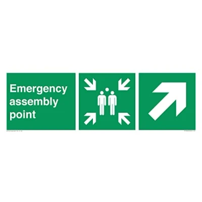 E908 : Up right arrow (45 deg supplimentary) This sign is made from vinyl / sticker Air Release vinyl makes it easy to stick to flat, clean surfaces without bubbles. Not for rough, plastic or dusty surfaces. 41 landscape Sign Text: Emergency assembly point directional Up right arrow