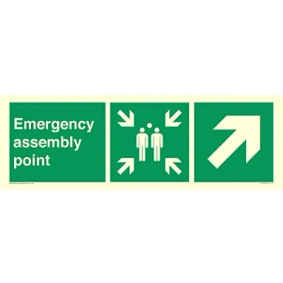 E908 : Up right arrow (45 deg supplimentary) This sign is made from vinyl photoluminescent sticker 62 landscape Sign Text: Emergency assembly point directional Up right arrow