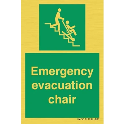 E060 : Evacuation chair This sign is made from vinyl gold sticker Gold metal effect sticker for flat, clean surfaces. Not for rough, plastic, or dusty surfaces. A8 portrait Sign Text: Emergency evacuation chair