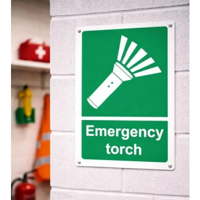 Emergency torch safety sign 1mm Plastic sign Digitally printed and laminated for extra durability Drill and screw in position or use double sided tape to mount onto suitable surface