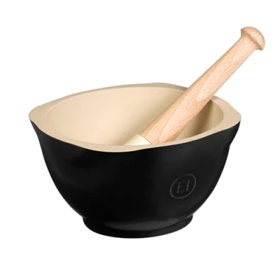 Harts of SturPrepare sauces, dips, and spices with the Emile Henry Black Truffle Ceramic Mortar & Pestle. The glazed interior prevents ingredients from slipping, resists stains and odours, and ensures easy grinding. With four rounded edges, it’s easy to handle, and the beech wood pestle with a ceramic head offers a comfortable grinding experience.Mortar & pestle dimensions: 8cm (H) x 15cm (W) x 15cm (L). Capacity: 0.45L. Weight: 0.67kg.Made in France and backed by a 10-year warranty, this ceramic mortar and pestle is a stylish, durable addition to your kitchen.