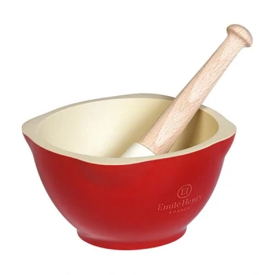 The Emile Henry burgundy ceramic mortar & pestle is ideal for preparing herbs, spices and ingredients for sauces, drizzles and dressings.The inside of the mortar is unglazed and will not stain or retain odours.The matching pestle is made from beechwood with a ceramic head in a burgundy finishThe Emile Henry mortar & pestle is made in France and is complete with a 10 year warranty.Dimensions: 15 x 20cm.Suitable for use in the oven, microwave, freezer and dishwasher withstanding temperatures of -20°C to 270°C.