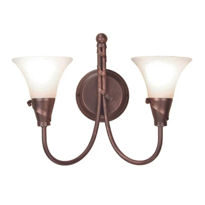 Lights.coHandmade Emily wall light - made in England The Emily wall light is characterised by a simplicity which is added to by a ribbon which curves around the frame. The copper patina gives it an elegant antique look. The opal glass shades provide good and pleasant light distribution.