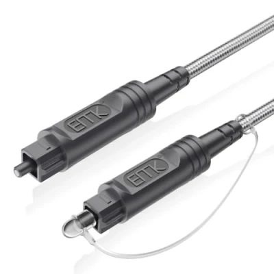 Optical audio cable feature a fully [OD4.0 Cotton braided jacket] and certified production to give you the highest quality longest lasting optical cables availableResist corrosion and offer a clear, smooth-flowing optimal signal. Perfect digital optical audio cable for Home Theater, Sound Bar, TV, PS4, Xbox, VD/CD player,Blu-ray players,Game console.Compatible with standard and high-definition devices with Toslink (S/PDIF, Optical,Digital) ports. Digital audio cable works with multi-channel surround sound,[High fidelity signal transfer]Uncompressed PCM audio and compressed 5.1 to 7.1 surround sound systems including Dolby Digital Plus, DTS-HD High Resolution and LPCM. PMMA Fiber Core: The signal of fiber optical audio cable is transferred by light source which eliminates electromagnetic interference [EMI] and radio frequency interference [RFI]. Premium Connector Protection: EMK's innovative dust cap system safeguards the 24K gold-plated terminals against dust and environmental damage when disconnected, maintaining pristine signal integrity for flawless audio transmission with every use.