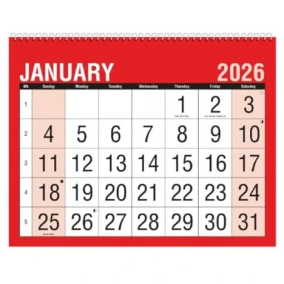 🗓️ MONTH-TO-VIEW DESIGN – See your entire month at a glance! Each page features one full month with large date boxes for appointments, birthdays, deadlines & notes 🌀 SPIRAL BOUND FOR EASY FLIPPING – Durable wire-bound top allows smooth page turning and keeps calendar neat, flat and functional throughout the year 🏡 IDEAL FOR HOME, OFFICE OR SCHOOL – Whether you're a busy family, teacher, student or professional, this monthly planner helps keep routines clear and manageable 🖊️ GENEROUS WRITING SPACE – Ample room in each daily box for important reminders and events, making this a perfect visual tool for planning ahead 📌 COMPACT & PRACTICAL – Measuring 27 x 21 cm, this slimline calendar fits well in kitchens, hallways, classrooms, study areas, or workplace desks 📅 COVERS FULL YEAR – Runs from January 1st to December 31st 2026 – a full year of planning and scheduling made simple 📦 PACKAGING MAY VARY - Due to different production batches, packaging design may differ.