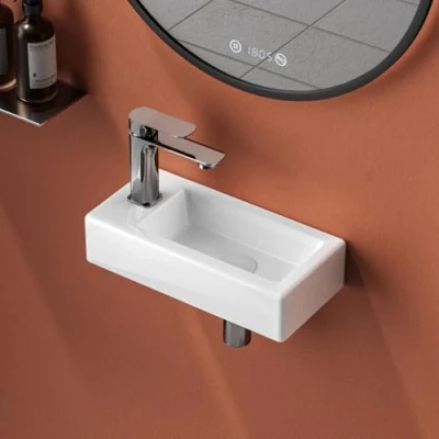 EMKE Wall Mounted Cloakroom Basin Small Corner Sink Rectangular Countertop Ceramic Bathroom Vessel White 40 x 28 14 cm (LxWxH) One Left Hand Tap Hole