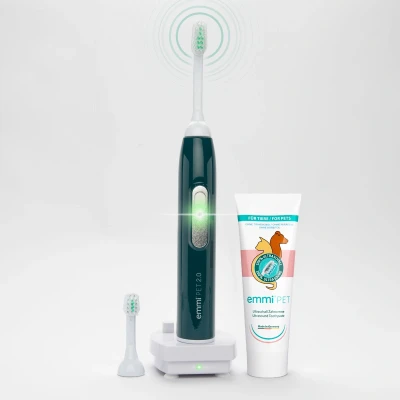 Emmi-Pet 2.0 Basic Set Ensure your dog's oral health with the Emmi-Pet Basic Set 2.0, an advanced ultrasonic toothbrush designed for effective and gentle dental care. Developed in Germany, this innovative product uses patented ultrasonic technology to deliver up to 96 million ultrasonic vibrations per minute, providing thorough cleaning without scrubbing. Please note, once purchased, this can't be returned as it is a hygiene product. Key Features: Ultrasonic Technology: Utilises 100% patented ultrasonic technology for deep cleaning, removing biofilm, reducing plaque, and preventing tartar build-up. Silent and Vibration-Free: Operates silently without vibration, offering a stress-free and pet-friendly experience, especially for anxious or sensitive dogs. Simply hold the toothbrush against the teeth and the ultrasonic waves will do the rest. Versatile Brushes: Includes two brushes (large and small) for dogs of all sizes and breeds. Effective Cleaning: Removes biofilm and loosens light tartar for easy removal with rosewood sticks / fingernails (human clinical study confirms biofilm removal). Reduces Gingivitis: Massages and strengthens the gums, reducing existing gingivitis and promoting overall oral health. Ergonomic Design: Easy to handle, ensuring a hassle-free tooth cleaning routine for your pet. 2-Year Warranty: Covers all defects on the device and the charging station. What's Included: Emmi-Pet 2.0 Toothbrush Large Emmi-Pet Ultrasonic Brush Small Emmi-Pet Ultrasonic Brush Emmi-Pet Ultrasonic Toothpaste (free from titanium dioxide and parabens) 2-Year Warranty: Covers all defects on the device and the charging station Directions For Use Ingredients (Ultrasonic Toothpaste): Meet the new toothpaste for dogs: pure joy in every tube. Titanium dioxide-free, without sorbitol, fluoride, or parabens. Elevate their smiles naturally! Contains: Aqua, Hydrated silica, Glycerine, Disodium Pyrophosphate, Tetrapotassium Pyrophosphate, Sodium C14-16 Olefin Sulfonate, Flavouring, Sodium Saccharin, Xanthan Gum, Zinc Lactate, Cetylpyridinium Chloride, Sodium Sulphate, Sodium Carbonate {{widget type="MagentoCmsBlockWidgetBlock" template="widget/static_block/default.phtml" block_id="1052" type_name="CMS Static Block"}} Frequently Bought Together: {{widget type="MagentoCatalogWidgetBlockProductProductsList" template="Magento_PageBuilder::catalog/product/widget/content/carousel.phtml" anchor_text="" id_path="" show_pager="0" products_count="20" condition_option="sku" condition_option_value="865952, 865953, 865954, 865940, 845296, 1056, 845361, 3292" type_name="Catalog Products Carousel" conditions_encoded="^[`1`:^[`aggregator`:`all`,`new_child`:``,`type`:`Magento||CatalogWidget||Model||Rule||Condition||Combine`,`value`:`1`^],`1--1`:^[`operator`:`()`,`type`:`Magento||CatalogWidget||Model||Rule||Condition||Product`,`attribute`:`sku`,`value`:`865952, 865953, 865954, 865940, 845296, 1056, 845361, 3292`^]^]" sort_order="position_by_sku"}} Emmi-Pet: Emmi-Pet, based in Germany, specialises in innovative ultrasonic dental care products for dogs and cats. Since 2008, our patented devices feature advanced, miniaturised ultrasonic chips, providing superior cleaning, prophylaxis, and therapy for pet oral and dermatological health. Combining German engineering with a commitment to pet wellness, Emmi-Pet ensures high-quality, effective dental care for your furry companions.