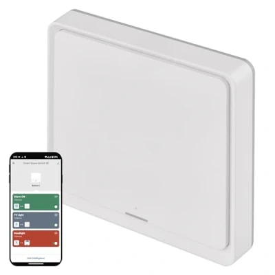 By pressing a single button of the ZigBee portable scene controller, you can easily control up to three devices or lights at the same time, automating repetitive activities in your home. For example, you can close the electric blinds in a moment, dim the light in the room and turn off the running air conditioning system The button of the scene switch detects three types of actuation - simple tap, double tap or long hold. This gives you a total of 3 combinations per button, with which you can conveniently control your home You can easily connect the battery-operated scene controller to other smart home devices or lights via a ZigBee gateway. With the EMOS GoSmart application, you can easily set individual scenes. ZigBee Gateway should be connected to your home Wi-Fi network Thanks to its low power consumption and high efficiency, the CR2430 battery that powers the portable switch lasts a very long time. At the same time, the scene controller does not have to be connected to the mains thanks to the battery operation Thanks to the high efficiency and low power consumption of the device that works with the ZigBee protocol, the CR2430 battery, which ensures the operation of the controller, will serve you for a long time and saves you the complicated connection to the power supply The free EMOS GoSmart app has been developed for Android and iOS systems and is based on the TUYA platform, which makes our app universal. Download the free EMOS GoSmart app from Google Play or App Store. Connect individual devices together, set up the automation of their activities and control them remotely via a fully localized and intuitive mobile phone app