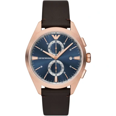 This Emporio Armani Claudio Chronograph Watch for Men is the perfect timepiece to wear or to gift. It's Rose Gold 43 mm Round case combined with the comfortable Brown Leather watch band will ensure you enjoy this stunning timepiece without any compromise. Operated by a high quality Quartz movement and water resistant to 5 bars, your watch will keep ticking. This classic watch gives a comfortable feeling with its Leather strap, it's perfect for every occasion This Chronograph watch has a calendar function: Date, Stop Watch and Luminous Hands High quality 21 cm length and 20 mm width Brown Leather strap with a Buckle Case diameter: 43 mm,case thickness: 11 mm, case colour: Rose Gold and dial colour: Blue