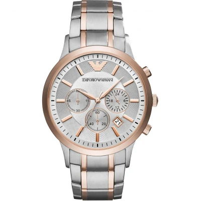 Emporio Armani AR11077 EAN 4053858895331 - Mens Renato Two Tone Rose Gold Chronograph Watch. Battery powered Quartz movement with three sub-dials with a Chronograph display.