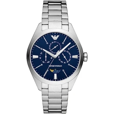 This Emporio Armani Claudio Multi Dial Watch for Men is the perfect timepiece to wear or to gift. It's Silver 43 mm Round case combined with the comfortable Silver Stainless steel watch band will ensure you enjoy this stunning timepiece without any compromise. Operated by a high quality Quartz movement and water resistant to 5 bars, your watch will keep ticking. Elegant and fashionable watch that is suitable for the daily life of every Men. This Multi Dial watch has a calendar function: Day-Date-Month , Moonphase and Luminous Hands High quality 21 cm length and 20 mm width Silver Stainless steel strap with a Deployment clasp Case diameter: 43 mm,case thickness: 10 mm, case colour: Silver and dial colour: Blue
