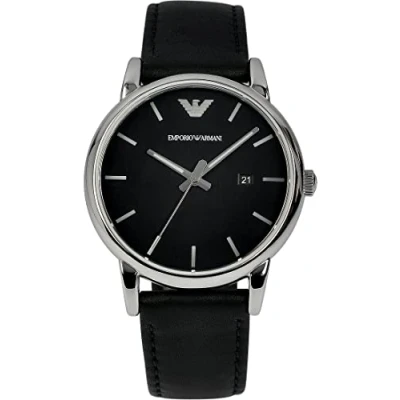 EMPORIO ARMANI men watch - Round stainless steel case (diam. 41 mm) in polished finishing - 5 ATM water pressure resistance construction Black genuine leather strap - Buckle. Lug Width: 20 mm Black dial in matte finishing with silver-tone indexes and eagle logo at 12 o'clock - 3 hand movement with date - Silver-tone hands - Mineral glass Packed in EMPORIO ARMANI gift box
