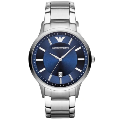 This Emporio Armani Renato Analogue Watch for Men is the perfect timepiece to wear or to gift. It's Silver 43 mm Round case combined with the comfortable Silver Stainless steel watch band will ensure you enjoy this stunning timepiece without any compromise. Operated by a high quality Quartz movement and water resistant to 5 bars, your watch will keep ticking. This fashionable and classic watch matches any outfit at any occasion,it adds style to your life -The watch has a calendar function: Date High quality 21 cm length and 21 mm width Silver Stainless steel strap with a Deployment clasp Case diameter: 43 mm,case thickness: 8 mm, case colour: Silver and dial colour: Blue