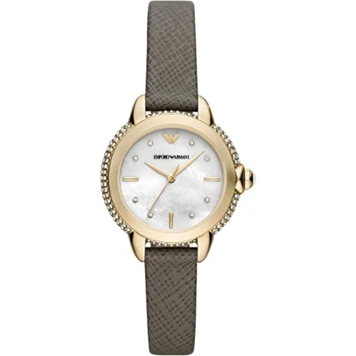 This Emporio Armani Mia Analogue Watch for Women is the perfect timepiece to wear or to gift. It's Gold 32 mm Round case combined with the comfortable Grey Leather watch band will ensure you enjoy this stunning timepiece without any compromise. Operated by a high quality Quartz movement and water resistant to 5 bars, your watch will keep ticking. Elegant and fashionable watch that is suitable for the daily life of every Women. It’s a great gift for your relatives and friends High quality 19 cm length and 12 mm width Grey Leather strap with a Buckle Case diameter: 32 mm,case thickness: 8 mm, case colour: Gold and dial colour: Mother of pearl