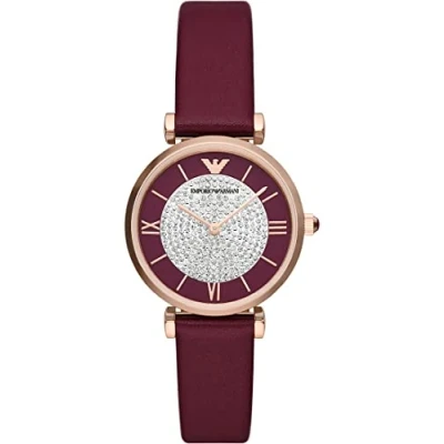 32mm case, 14mm band width, mineral crystal, Quartz movement with 2-hand analog display, imported Round at least 50 percentage recycled stainless steel case, with a multicolor dial Purple, leather band Water resistant up to 30m: Will withstand splashes in water.