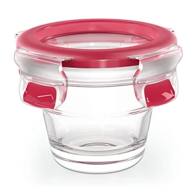 Emsa Clip & Close Glass Food Storage Container, Round, 0.1 L, 100% Leak Proof, Non Slip Stacking, Dishwasher, Freezer, Oven, Microwave Safe, Red, Transparent, N10401