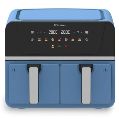EMtronics 9L Dual Zone Air Fryer 2400W Family Size, 8 Preset Cooking Mode, Match Cook & Smart Finish Functions, 9 Litre Aqua Blue