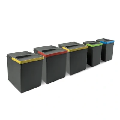 Set of H 266 mm (10,4 inch) high containers: 3 x 15 litre containers and 2 x 7 litre containers. One of the 15 liter container includes a cover with a slot for an odour-neutralising tablet and a citrus-scented tablet that neutralises bad odours, keeping the inside of the drawer fresh for up to 2 months. They have coloured handles in order to make easier the sorting of waste and to allow to easily extract them to empty and clean them. To fit the bag to the square design of the container, it is recommended to use a bag with a larger capacity than the volume indicated for the container. In order to avoid they move while the drawer is opening or closing it is recommended to buy together with a cut-out base for drawer (not included). Made from anthracite grey plastic.