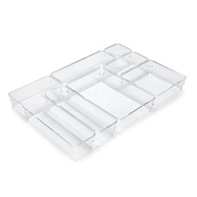 Kit of organisers for bathroom, kitchen or wardrobe drawers available in various sizes and stackable. Adaptable to any type of drawer. The kit consists of 1 bucket of 75x75x54 mm, 2 buckets of 75x151x54 mm, 1 bucket of 153x153x54 mm, 3 buckets of 76x228x54 mm and 1 bucket of 228x154x54 mm. The arrangement of the buckets inside the drawer is customised. Silicone drops (included in the kit) can be added to prevent the buckets from sliding inside the drawer. The buckets are resistant and easy to clean. Made of plastic with a transparent finish., Weight: 1.543235834 pounds, Manufacturer: Emuca