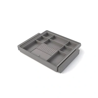 Kit consisting of an organizer drawer and a frame with adjustable width guides for 60 cm modules. Suitable for a wardrobe interior gap of 562 - 588 mm with a minimum depth of 460 mm. Each of its guides features an adjustment of up to 13 mm, ensuring a perfect installation in any wardrobe space. Frame with soft-close guides and full extension that supports up to 30 kg of weight. Made from high-quality plastic and aluminum with an elegant titanium finish (RAL 7039). It is easy and efficient to assemble—just screw it into the side of the wardrobe. Designed to fit different wardrobe widths, thanks to an adjustable regulation of up to 13 mm in each of its guides and the included spacers. Includes 1 organizer drawer for wardrobes and closets, with 10 compartments perfect for storing jewelry and other accessories. With a width of 440 mm and a depth of 420 mm, it includes 4 plastic supports for fixation. Made with high-quality materials such as eco-leather and wood, with an elegant titanium-colored finish that combines durability and design. Includes all necessary hardware for assembly.