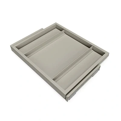 Kit with a 483mm (19 inch) tray and an adjustable width runner frame. Suitable for an internal cabinet opening of 560 - 594 mm (22 - 23,4 inch) (M60). Minimum cabinet depth 450 mm (17,7 inch) . Each slide can be adjusted up to 17 mm (0,67 inch) Frame with soft-close runners and partial extraction. Made of aluminium and plastic with a textured painted finish in stone grey. Metallic tray made of steel with a textured painted finish in stone grey. It has steel dividers that are attached to the tray thanks to the magnetic strip on its base. Includes all necessary hardware for assembly.