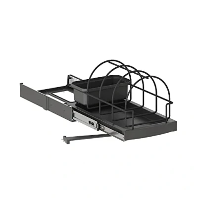 Tray for kitchen accessories with lower fixing and manual extraction, which allows cleaning products to be stored in the cupboard under the sink. It has ball guides with total extraction for easy access manually or automatically if it is fixed to the door. It is easy to install by screwing it to the bottom of the module with screws included in the product, and it can also be mounted on both the right and left sides of the cabinet. It is valid for installation in modules with minimum internal measurements of width 260mm (10,2 inch), depth 450mm (17,7 inch) and height 250mm (9,84 inch). It is made of steel and plastic in an anthracite gray finish. It includes an auxiliary plastic tray for the cloths and a steel structure that allows the detergent bottles to be organized., Weight: 7.495716908 Pounds, Manufacturer: EMUCA