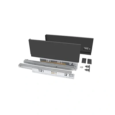 Kit of fittings needed to assemble an exterior drawer with a height of 131 mm (5,1 inch) and depth of 450 mm (17,7 inch), apart from the front, back and bottom. Sized for a board thickness of 18 mm for the bottom and back of the drawer. Synchronized total extraction runners, with soft closing and load capacity of 40 kg. Adjustment of the front: ±2mm in vertical and ±1mm in horizontal. Made of anthracite gray painted steel., Manufacturer: Emuca