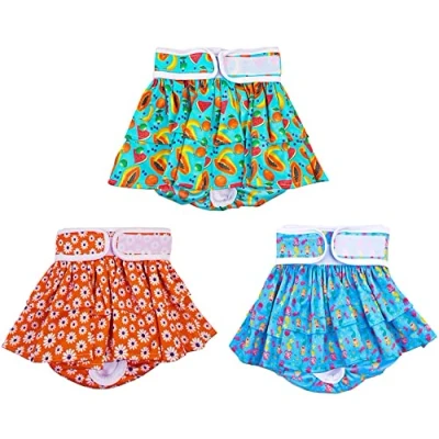 【3 SIZES AVAILABLE FOR MOST BREEDS】Available in 3 sizes from S to L, perfect for most breeds like Yorkie, Chihuahua, Pug, Poodle, Beagle, Schnauzer, Bulldog, Boston Terriers, Corgi, Shepherd, Doberman, Border Collie, Golden Retriever, Labrador etc. Measure your dog waist girth twice before purchase. If your dog is in between sizes, factor in their weight, A heavier dog go up a size. A skinnier dog go down a size. 【Diapers For Female Dogs】The dog diapers are specially designed for female dogs. The reusable diaper is easy to put and take off. Doggie nappies female are useful for untrained puppies, female dogs in heat, and dogs that suffer from incontinence due to excitement urination, age, or illness. Machine washable. WHEN CLEANING, PLEASE CLOSE THE MAGIC STICKER TO PREVENT THE MAGIC STICKER FROM STICKING TO OTHER PARTS IN THE CLEANING PROCESS. 【Soft & Reusable Fabrics】The reusable dog absorbent diapers are made of one breathable mesh material, 3 highly absorbent cotton layers, and one waterproof outer layer, do not require special detergents or special washing methods, just toss the diapers in the washing machine or hand wash them, the reusable sanitary panties will last a long time even with multiple washes and support low-temperature drying. More environmentally friendly and safe, and let you get rid of a lot of inconveniences. 【DOG DRESSES WITH 3 PATTERN】 Our doggie female diapers adopt skirt design, there are 3 different lovely patterns in a pack, making your dog becoming the focus of the crowd. With adjustable hook and loop, they are easy to put on and take off, extremely useful for untrained puppies, female dogs in heat, and dogs that suffer from excitement urination or incontinence. Product Warranty:We supply 30-day full money back and 12-month quality guarantee if the product has any quality problem. Please feel free to contct us if you need any help, we will answer your questions within 24 hours.