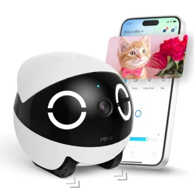 Movable Robot & 2K Resolution: Roll and roam, your pet's adventures come home! With 2K resolution, the ROLA Mini robot pet camera ensures stunning clarity for every adorable moment. Roam and catch every playful adventure in real time Cute Eye Light & Multi-Device Sharing: Share the love, Connect everyone! With a delightful eye-light design, ROLA Mini brings extra charm to every shot. Share the robot camera with your family and friends and enjoy the fun together One-Touch Call & Two-Way Audio: Talk with ease, pet love's a breeze! Press the call button on ROLA Mini and it will reach your phone instantly. With the built-in mic and speaker, you can speak with your loved ones anytime anywhere IR Night Vision & Video Recording: Catch the play, night or day! Featured with four infrared LEDs, the ROLA Mini can display clear images even in low light conditions. Included with a 32 GB memory card, never miss any cherished moment of your love Battery-Powered & Magnetic USB-C Charging: Long-lasting fun, powered on the run! ROLA Mini features a 5000 mAh battery that ensures extended playtime. With magnetic USB-C charging, it's easy to recharge and go again - Just snap it in What's In The Box: ROLA Mini 2K Camera Robot *1, Magnetic USB-C Cable *1, 32GB MicroSD Card *1, Manual *1, Weight: 1.6975594174 Pounds, Manufacturer: Enabot