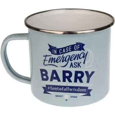 Our stylish enamel mugs provide a true camping experience. The perfect fun gift for your friend or relative called Barry with personalised message "In case of emergency ask Barry #fontofallwisdom." With a steel interior coated in enamel for a glossy finish, these mugs have a light blue base with navy blue and white text.. Aside from looking fantastic these durable mugs are great at retaining heat, so you can enjoy your coffee or tea for much longer. Lightweight compared to other mugs you won't have to worry about them weighing down your hiking backpack.. 1 x Enamel Personalised Coffee Mug Barry. "In case of emergency ask Barry #fontofallwisdom". 500ml. 9.5 x 9.5 x 8.5 cm. Perfect for camping