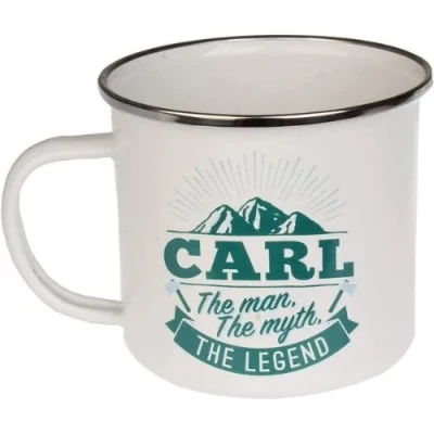 Our stylish enamel mugs provide a true camping experience. The perfect fun gift for your friend or relative called Carl with personalised message "Carl, the man, the myth, the legend." With a steel interior coated in enamel for a glossy finish, these mugs have a white base with bold green lettering.. Aside from looking fantastic these durable mugs are great at retaining heat, so you can enjoy your coffee or tea for much longer. Lightweight compared to other mugs you won't have to worry about them weighing down your hiking backpack.. 1 x Enamel Personalised Coffee Mug Carl. "Carl, the man, the myth, the legend". 500ml. 9.5 x 9.5 x 8.5 cm. Perfect for camping