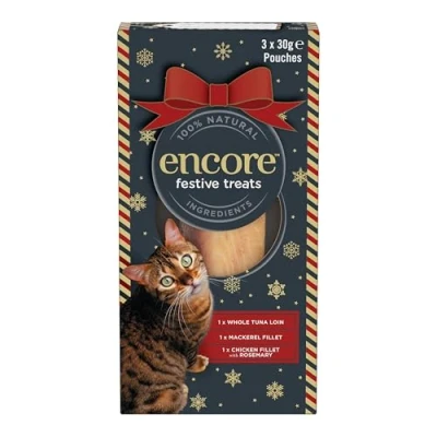 Encore 100% Natural Cat Treat Loins Festive Variety, Grain Free (Tuna, Mackerel & Chicken with Rosemary) Pack of 3 x 30 g