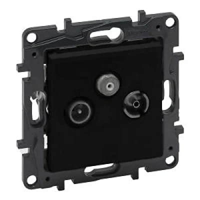 The Niloe Step range includes products made from high-quality materials. The black socket fits perfectly with any interior. It is ideal for both new homes and rooms that already have a certain style. Used in single systems where the sockets are connected in series. End sockets are used to complete through-through installations. Supplied with rocker / cover, spreader claws and support frame, for use with a frame, suitable for expansion claw and screw mounting TV: 5-68 MHz/120-862 MHz, SAT: 950-2400 MHz, R: 87.5-108 MHz TV: male connection (diameter 9.5 mm), SAT: type F connector (diameter 9.5 mm), R: female connection (diameter 9.5 mm) Attenuation: 10 dB Protection class: IP20, Manufacturer: Legrand